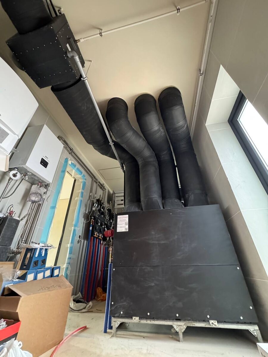 У нашего заказчика Антона в котельной, мы разместили приточно-вытяжную установку TURKOV HECO - 1200 W с рекуператором и водяным нагревателем, а так же адиабатическим увлажнителем воздуха HUMIBOX 1500 (PUMP 3), который встроен в воздуховод подачи свежего воздуха с улицы.