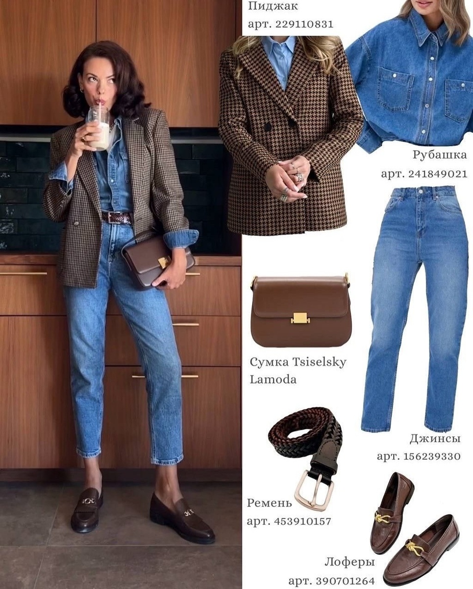 ОБРАЗ 1. Деним + клетчатый пиджак и шоколадные аксессуары