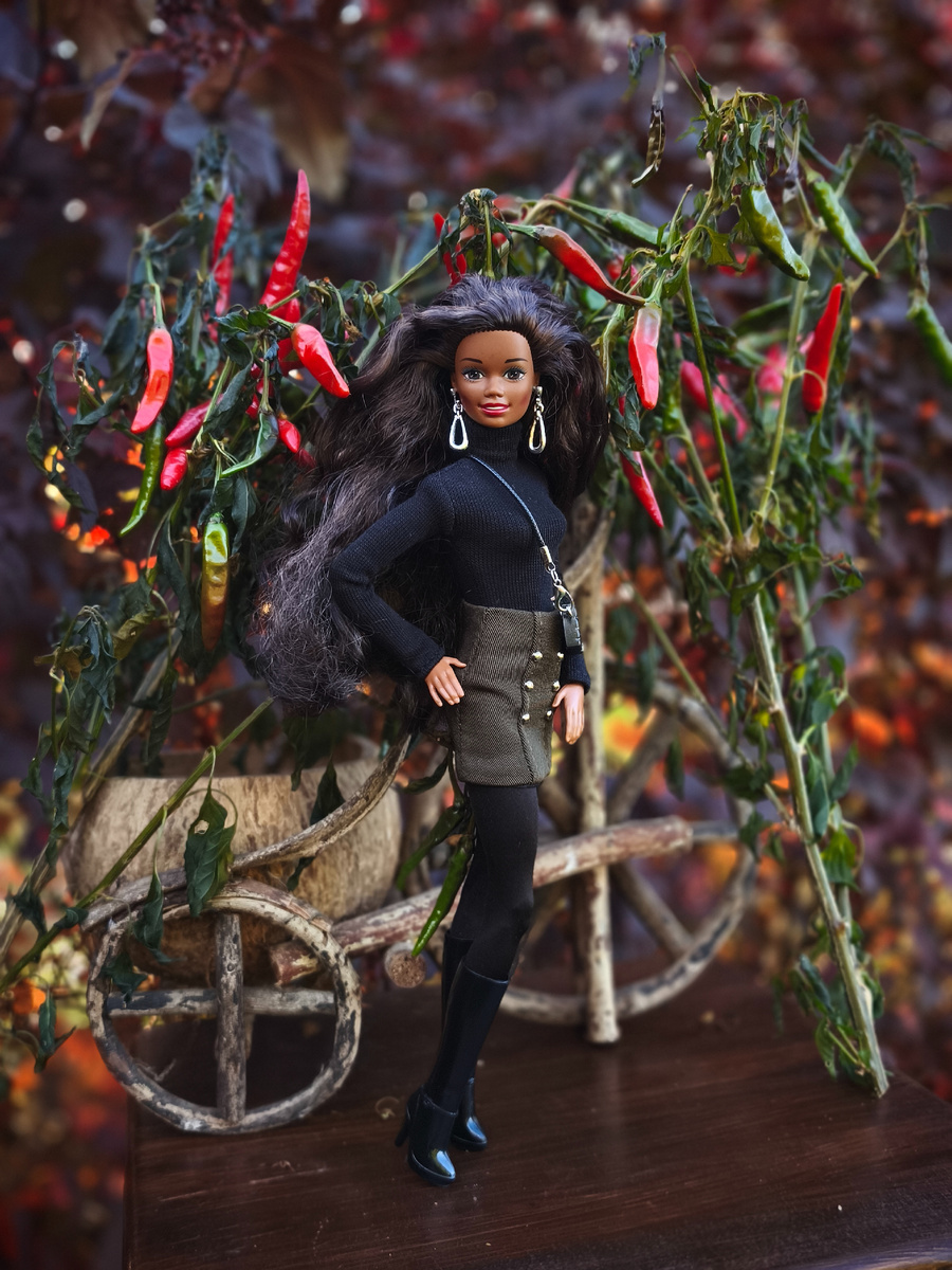 Выходные провели у свекров, а значит, в ближайшие дни на моем канале будет много контента) Там природа, нет лишних глаз и куча фактурных уголочков, вот мое кукло-фото-творчество и выкручивается на максимум) И первой хотелось бы показать Кристи. Наборчик из водолазки и юбки был куплен давно, и ждал своего часа. Мне он видится очень интеллигентным и осенним. На дворе осень - значит, порв его выгуливать. Образ дополнили колготками, сапожками от базовой Кло и микро-сумочкой с али. А честь представить все это великолепие досталась Кристюше. Люблю ее лучистую улыбку и роскошную копну волос! А перед съемкой во дворе я заметила ветки с острыми перчиками. Заморозки накануне их погубили, и мама мужа их срезала. И подумалось - а что, если разбавить кадр этими веточками? И скажу честно, мне очень понравился результат!) Кристи такая хитренькая с яркими красными перчиками) И я довольна светом, и тем, как камера его передала. Кроме перчиков, сняли еще несколько в других локациях. Хотелось по ма