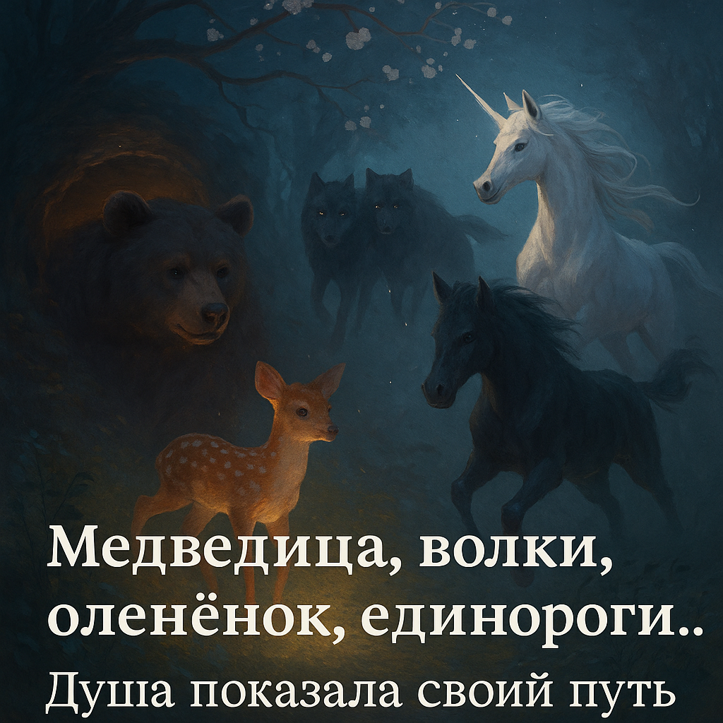 Иногда медитация становится не просто расслаблением, а настоящим путешествием — туда, где Душа говорит образами. Сегодняшняя практика показала мне целую цепочку символов, как будто фрагменты внутренней карты, ведущей к новому этапу. 🐎 Свет и тень: два единорога Сначала я увидела двух лошадей — белую и тёмную, будто двух единорогов, бегущих рядом. Они не соревновались, не боролись, просто двигались синхронно. Я почувствовала, что это два полюса во мне — светлый и тёмный, духовный и земной, женский и мужской — наконец нашли общий ритм. Это не борьба, а союз. 🦒 Дальнозоркие жирафы Следом появились два жирафа — пара, смотрящая вдаль. Они напомнили мне, как важно видеть картину целиком, не застревая в деталях пути. Это про мудрость, терпение и способность держать фокус не на страхах, а на высоте своей Души. 🐻 Медведица и волки: испытание защиты Потом я увидела медведицу с детёнышем в берлоге. Это тепло, защита, материнская сила. Но вдруг — стая волков, нападение, хаос. Я почувствова