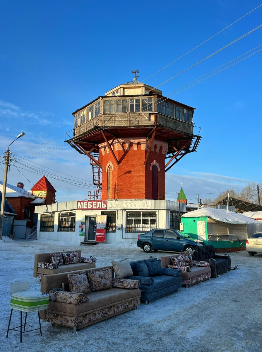 В городе Чистополь (это в Татарстане) есть уникальная водонапорная башня😻. По мимо того что она выглядит шикарно и не похожа на другие «водонапорки», так ещё и стоит она прямо в центре городского рынка (что тоже крайне сложно встретить где-то ещё). Все источники (которые я нашёл) говорят, что построена она в 1910 году, после чего в городе был введен в эксплуатацию чистопольский водопровод, созданный на средства купца В.Л. Челышева. Однако, на крыше флюгер с 1986 годом. Возможно это связано с кафе которое тут было, об этом поделились милые продавщицы на рынке). Они сказали, что после того, как кто-то навернулся со ступеней кафе прикрыли. © Алексей Трубицын