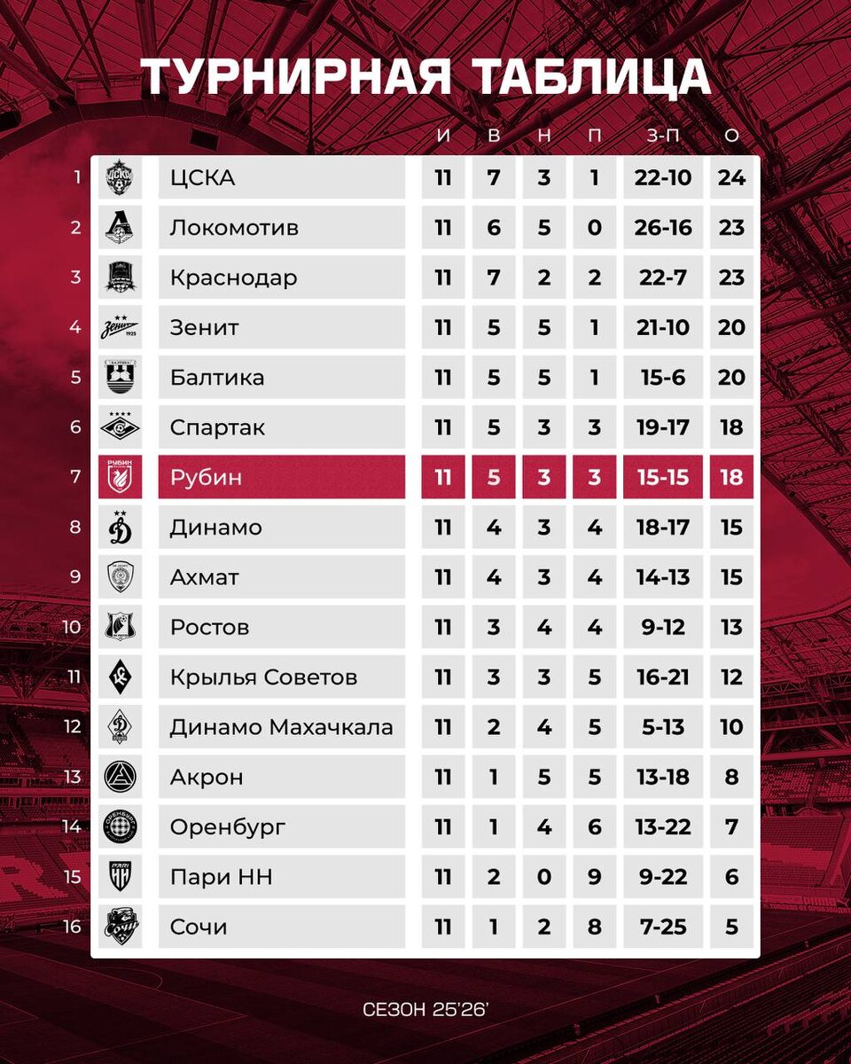 Турнирная таблица МИР РПЛ по итогам 1️⃣1️⃣ тура 📊