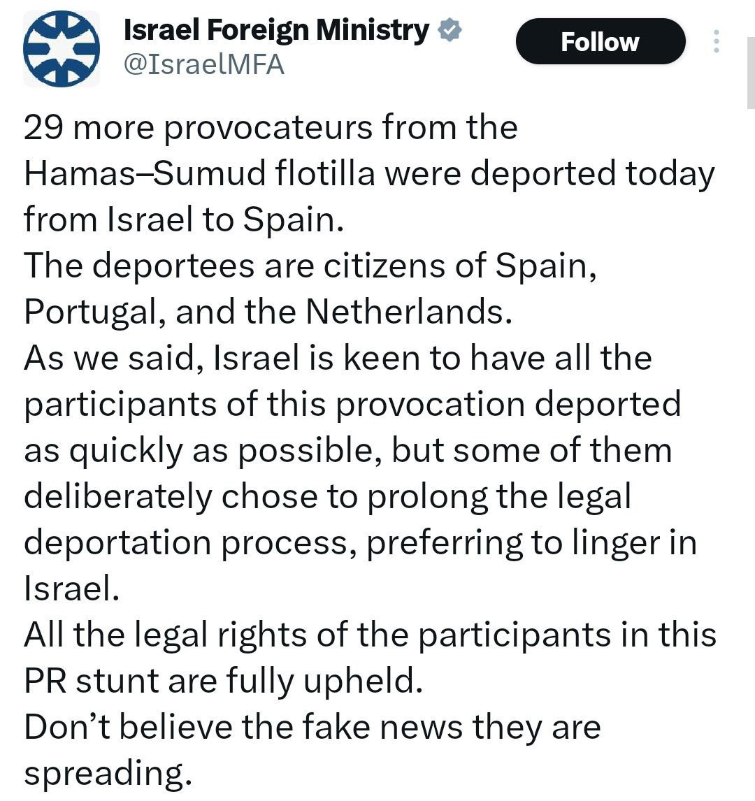 В ответ на пост Another 29 Gaza aid flotilla crew 'provocateurs' DEPORTED, this time to Spain Israeli FM: 'Don't believe the fake news they're spreading'
