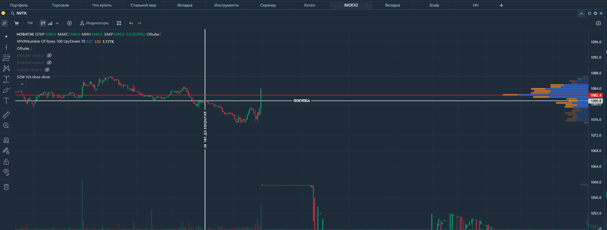 3 октября 2025 года компания Новатэк - последний день торгов с дивидендом. Закрытие торгов на уровне 1084 рубля. Размер объявленного дивиденда составил 35,5 рубля на одну акцию, что соответствует дивидендной доходности (ДД) 3.27%. 4 октября 2025 года, сразу после начала торгов, Новатэк открылся на отметке 1059,4 руб., упав всего на 24.6 (2,28%). Что соответствует 1% прибыли. Поскольку заработок на дивидендной стратегии подразумевает вход в сделку за час до закрытия рынка, то цена входа была бы около 1080.8 руб. Нижняя горизонтальная линия (1045.4) уровень выхода в прибыль трейдерам, чья налоговая база позволяет оптимизацию налогов. (1-я категория) Верхняя горизонтальная линия (1050) показывает уровень выхода в прибыль трейдерам, которым необходимо учитывать стандартную ставку налога в размере 13%. (2-я категория). По итогам торговли, по стратегии "покупки за час до закрытия", шанс заработать был в обеих категориях. 0,8% и 0,3% В этот раз, на медвежьем рынке, выйти в плюс помогли сооб