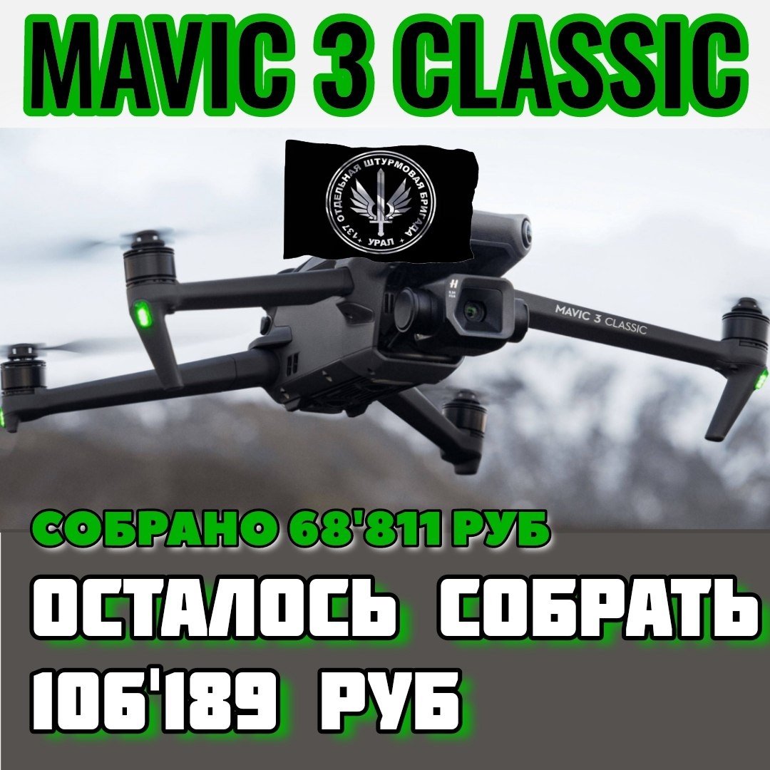 Друзья, отличного завершения недели вам. А мы продолжаем очень сложный сбор на: 🟢 БПЛА MAVIC 3 CLASSIC для штурмовиков: 📌Сумма к сбору - 175'000 руб. 🔺Собрано -68'811 руб. 🔺Осталось собрать - 106'189 руб. Давайте поднажмем, парням жизненно необходима наша поддержка! Любую посильную сумму можно перевести на номер карты 💳2202208188194204 или по номеру телефона 📞+79530562233 Получатель - Светлана Владимировна Л. ("Сбербанк")