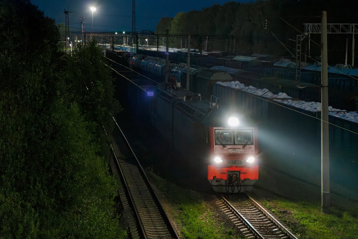 Ночной 2ЭС7-007 по станции Лянгасово