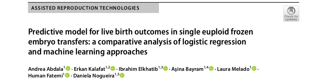 Источник: Abdala A, Kalafat E, Elkhatib I, Bayram A, Melado L, Fatemi H, Nogueira D. Predictive model for live birth outcomes in single euploid frozen embryo transfers: a comparative analysis of logistic regression and machine learning approaches. J Assist Reprod Genet. 2025 Aug;42(8):2641-2650. doi: 10.1007/s10815-025-03524-3. Epub 2025 May 22. PMID: 40402397; PMCID: PMC12423375.