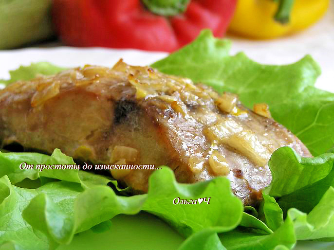 листья салата для подачи Приготовление: Рыбу посолите, поперчите, выложите в форму для запекания, смазанную маслом. Для маринада смешайте измельченный чеснок, мелко нарезанный лук, соевый соус, лимонный сок и растительное масло. Рыбу залейте маринадом, оставьте на 30 минут. Затем запеките при 200*С 25-30 минут, накрыв форму фольгой. За 5-7 минут до окончания приготовления фольгу снимите. Готовую рыбу выложите на листья салата и подавайте с любым гарниром. Приятного аппетита! Вам также могут понравиться: