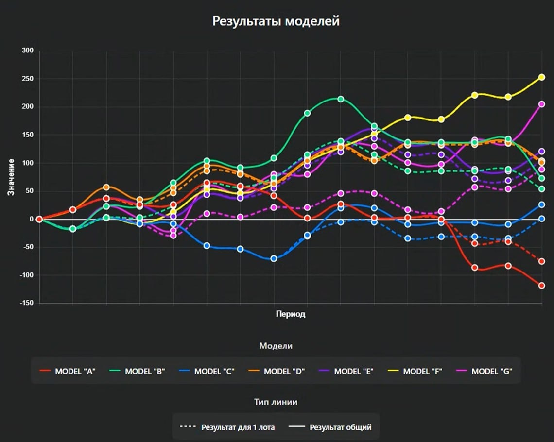 📊 03.10.2025 ┌──────┬────────┬──────┬────┬────────┬────────┐ │МОДЕЛЬ│ПРОГНОЗ │ ВЕР. │ЛОТ │ 1 ЛОТ │ ИТОГ │ ├──────┼────────┼──────┼────┼────────┼────────┤ │ A │ Выше↑ │ 0.63 │ 1 │ -35 │ -35 │ │ B │ Выше↑ │ 0.65 │ 2 │ -35 │ -70 │ │ C │ Ниже↓ │ 0.60 │ 1 │ 35 │ 35 │ │ D │ Выше↑ │ 0.60 │ 1 │ -35 │ -35 │ │ E │ Ниже↓ │ 0.70 │ 1 │ 35 │ 35 │ │ F │ Ниже↓ │ 0.65 │ 1 │ 35 │ 35 │ │ G │ Ниже↓ │ 0.80 │ 2 │ 35 │ 70 │ └──────┴────────┴──────┴────┴────────┴────────┘ Накопительный итог 15.09-03.10.2025 📅 ┌────────────┬───────┬────────┐ │ Модель │ 1 лот │ Общий │ ├────────────┼───────┼────────┤ │ MODEL "A" │ -75 │ -118 │ │ MODEL "B" │ 54 │ 73 │ │ MODEL "C" │ 1 │ 26 │ │ MODEL "D" │ 101 │ 104 │ │ MODEL "E" │ 104 │ 121 │ │ MODEL "F" │ 253 │ 253 │ │ MODEL "G" │ 89 │ 205 │ └────────────┴───────┴────────┘