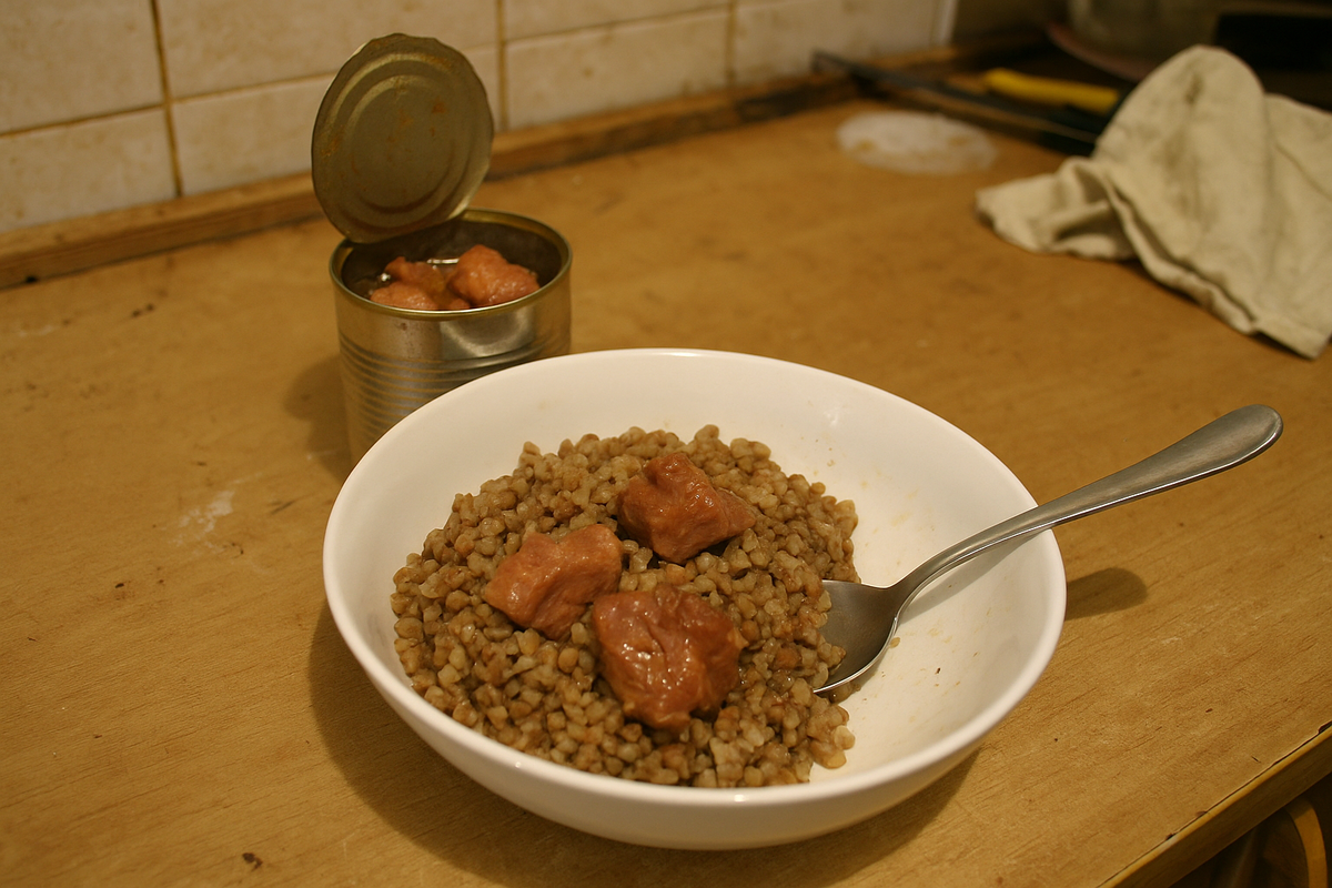 Гречку с тушёнкой никто не учит готовить. Это как заварить чай или почесаться. Просто как-то с детства знаешь, как надо. Но всё равно каждый раз выходит по-другому. Вчера было поздно. Возвращался домой, сил — ноль. Открываю шкаф — макароны, рис, пшено, какая-то крупа без подписи. Но рука тянется к проверенному: гречка + тушёнка. Старый добрый тандем, как майка и тапки. На сковородку — тушёнку. С грохотом, с этим характерным “жжжж” — будто привет из армии. Не разбираю, что там за мясо. Главное, чтоб жир вытопился. Это же и соус, и аромат, и чуть-чуть утешения. Потом гречка. У меня она уже была варёная — оставалась с обеда. Если нет — да хоть в кастрюле параллельно ставь, несложно. Перемешал. Поперчил. Понюхал. И всё. Ни тебе зелени, ни сыра, ни соуса «терияки с ароматом сакуры». Просто сковородка, ложка и тишина. Сел есть прямо у плиты. Никого не ждал, никуда не торопился. Пахло, как на выезде, когда палатки, костёр и кто-то не взял спички, но зато тушёнки приволок три банки. Гречка с т