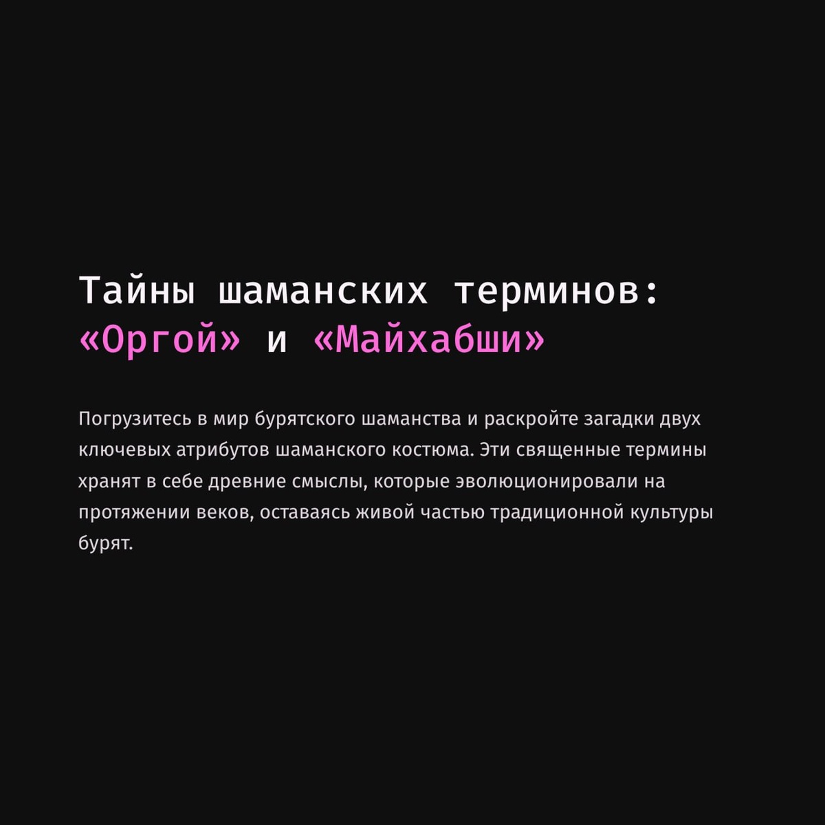 Тайны шаманских терминов: «Оргой» и «Майхабши» Погрузитесь в мир бурятского шаманства и раскройте загадки двух ключевых атрибутов шаманского костюма. Эти священные термины хранят в себе древние смыслы, которые эволюционировали на протяжении веков, оставаясь живой частью традиционной культуры бурят. Больше о бурятской культуре и истории — в нашем канале 👉 https://t.me/universe_buryat