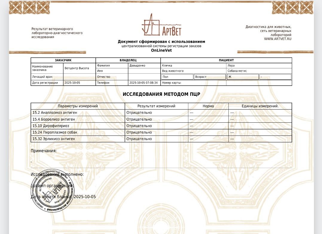 Только что прислали анализы Лерочки на пироплазмоз и прочую гадость по клещу