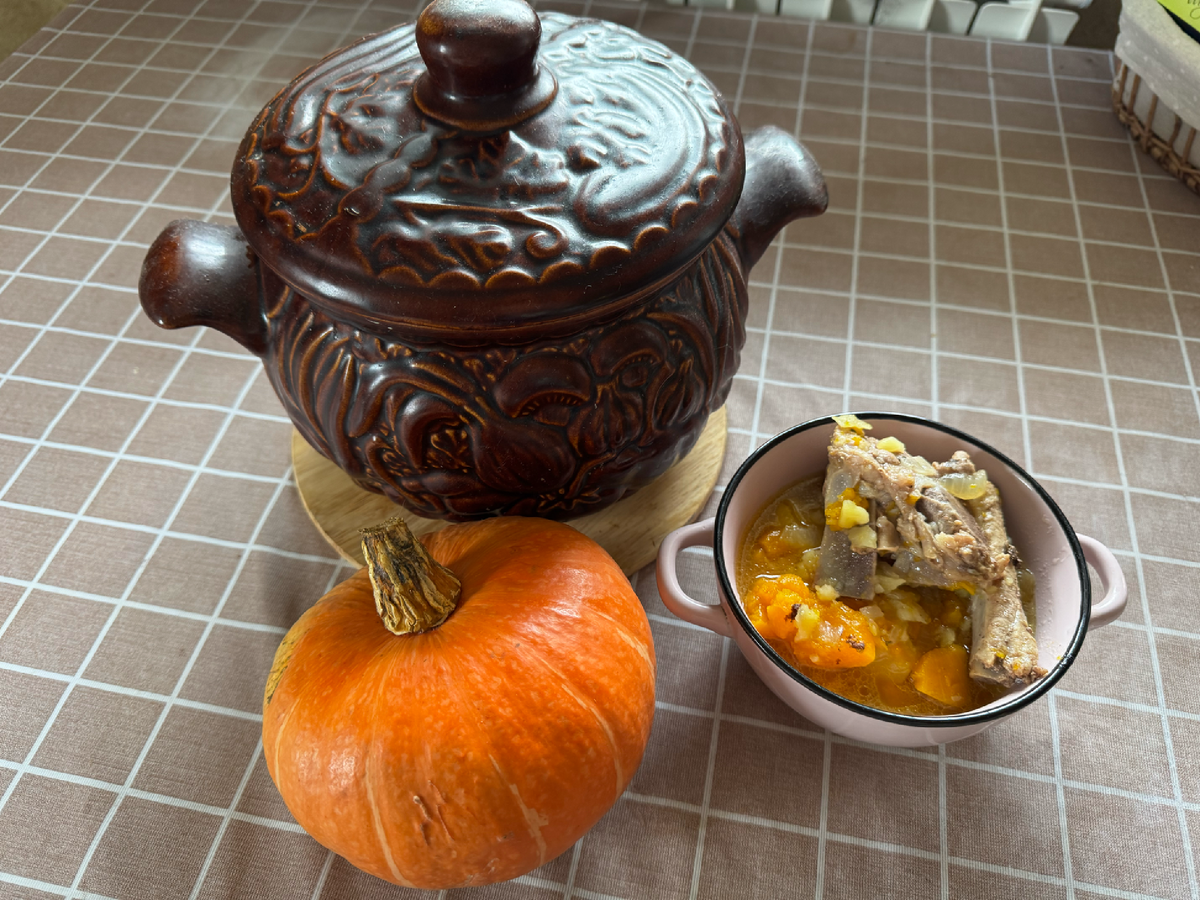 Продолжаем "Тыквенный марафон"! У нас уже пошла вторая неделя. Сегодня предлагаю приготовить необычную тушеную картошку - с добавлением тыквы. Итак, начнем. Я взяла ребра для тушения. Но вполне подойдет любое мясо. Свинина, курица, все что Вам нравится. Обжариваем на сковородке или в казане с небольшим количеством растительного масла. Туда же добавляем репчатый лук и тоже обжариваем. Чистим и нарезаем картофель. Достаточно крупно. Тыкву тоже моем, чистим, убираем семена. Нарезаем крупными кубиками. А дальше у нас два варианта. Первый - можно просто добавить картофель и тыкву в казан, где Вы уже обжаривали мясо с луком. Вариант второй - берем большой керамический горшок для запекания. Перекладываем туда обжаренное мясо с луком, картофель и тыкву. И тушиться уже все будет в духовке. Я предпочитаю керамический горшок для запекания. Обязательно солим, перчим. А дальше можете дать волю своей фантазии. Если любите сладковатые блюда - добавьте чернослив. А если предпочитаете легкую кислинку -