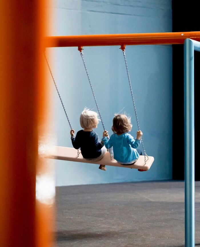 Просто доброе фото: двое малышей на одной качели, оба в простых ярких кофточках, волосы взъерошены ветром. Такая картинка сразу переносит в детство, когда мир казался огромным, а самое важное — это лететь навстречу ветру, раскачиваться до самого неба и смеяться без причины. Глядя на это фото, невольно хочется снова стать ребенком, забыть обо всех заботах и быть по-настоящему счастливым, как эти двое на качелях.