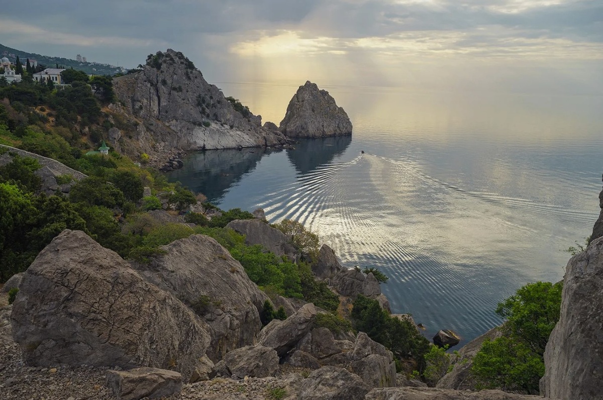 Берег у села Кацивели в Крыму известен необычными скалами и видом на Ай-Петри. Здесь особенно красиво ранним утром, когда море спокойно.