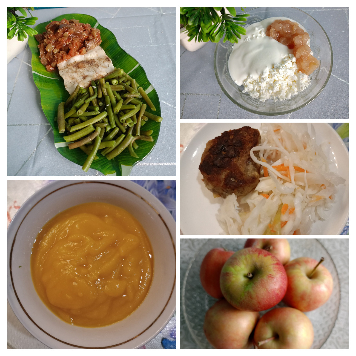 •Завтрак - филе минтая припущенное, стручковая фасоль на пару, запечённые баклажаны и перец, творог 5% с мацони и яблочным пюре.