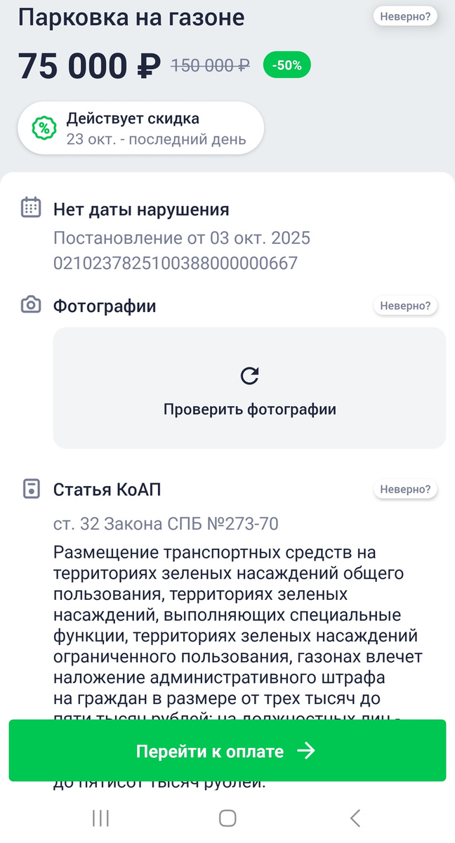 Добрый вечер Пикабу. Нужна ваша помощь. Прилетел странный штраф за парковку на газоне. На газоне не паркуюсь никогда и нигде. Нет ни фото, ни даты нарушения, что странно. И почему-то скидка 50%, хотя уже давно скидку на штрафы сделали 30%, если не ошибаюсь. Постановление пробивается на сайте ГИБДД и в приложении Штрафы ГИБДД, однако в сторонних приложениях его не найти. И в приложениях банков тоже штраф не находится. И собственно вопрос знатокам, сталкивался ли кто-то с чем-то подобным? Может какая-то мошенническая схема, которая обошла меня стороной? Заранее спасибо. Подписаться на Пикабу Познавательный. и Пикабу: Истории из жизни.