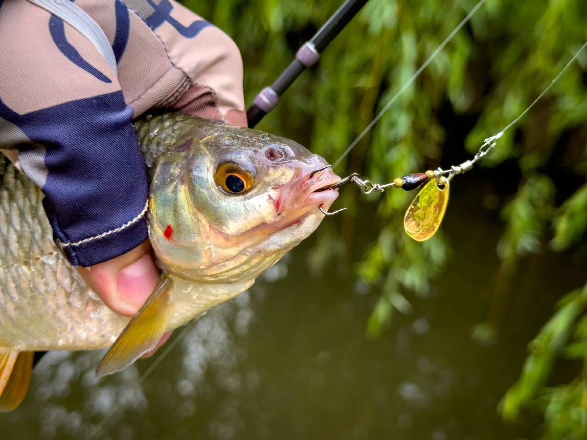 Ловля плотвы на блёсны — как на колеблющиеся, так и на вращающиеся — для меня уже давно перестала быть чем-то удивительным. При подходящем стечении обстоятельств эта рыба вполне регулярно реагирует на приманки, которые традиционно считаются для неё нетипичными. Разумеется, сама блесна должна быть небольшого размера. Подача — максимально замедленная, без резких рывков и ускорений. Немаловажную роль играет и погода: в тёплые, устойчивые дни плотва проявляет наибольшую активность и охотнее выходит за движущимся объектом. Когда рыба активна, она нередко выдаёт своё присутствие. В толще воды можно заметить характерные блики, у поверхности — всплески, а у прибрежной растительности — движение и возню в поисках корма. Обнаружив стаю, важно действовать осторожно: заброс лучше выполнять чуть дальше или выше по горизонту, чтобы не насторожить рыбу, а саму проводку вести в стороне от скопления. При грамотной подаче самые смелые экземпляры быстро отделяются от стаи, сопровождают приманку и решаются
