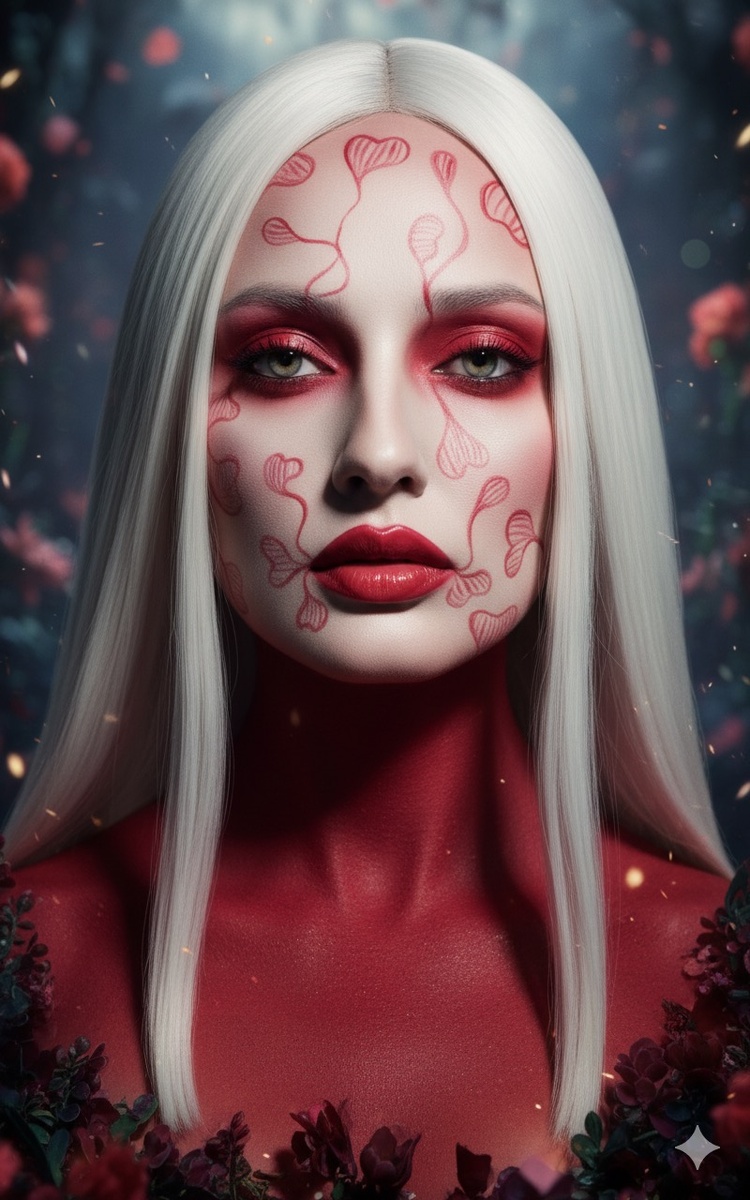 Создать постер для фильма фэнтези про креативный макияж. Сильно стилизованный портрет того же человека на изображении с резкими чертами лица. Освещение драматичное и кинематографичное, подчеркивающее структуру ее лица и придающего атмосферу роскошного модного журнала, ультрареалистичный, высокодетализированный, редакционный стиль фотографии. Разрешение 8к, симметричная композиция, минимальные элементы фона, соотношение сторон 4,3.