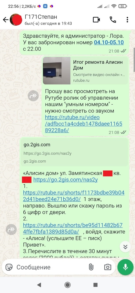 Гости бронируют (делают предоплату на сайте), я их сразу набираю по телефону (беру разрешения кинуть информацию по заезду на Вацап) - а они ее НИКОГДА не смотрят и не читают. Хотя я в разговоре прошу сразу посмотреть ПЕРВОЕ ВИДЕО - основы управления "умным номером".