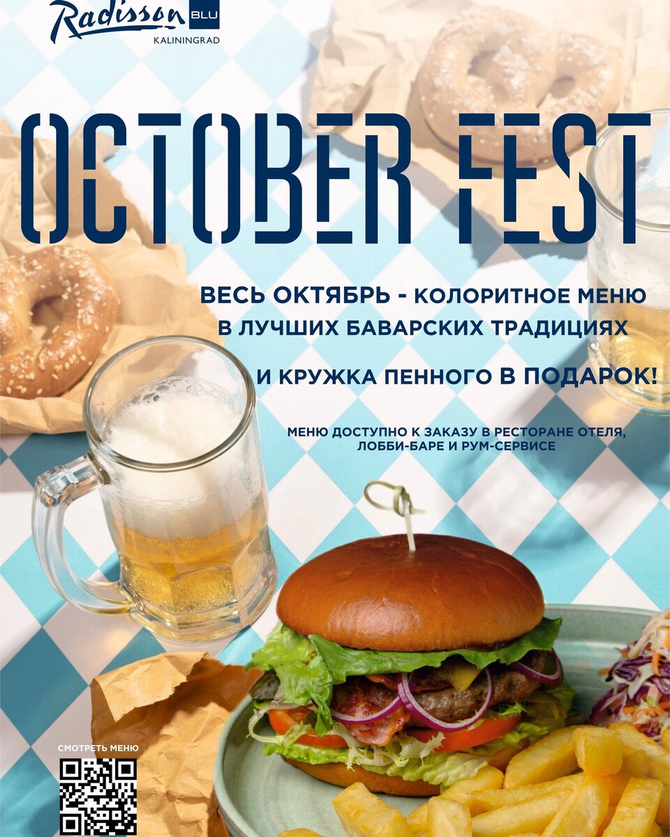 Знаете ли вы, что легендарный Октоберфест родился в 1810 году в Мюнхене? 🎉 Традиционно он начинался как празднование свадьбы баварского принца Людвига и принцессы Терезы, а со временем превратился в самый крупный пивной фестиваль мира с яркими традициями, музыкой и национальными блюдами. Сегодня дух Октоберфеста продолжается в Radisson Blu Калининград: уютная атмосфера, живое общение, фирменные закуски и, конечно, кружка пенного каждому гостю! 🍻 📍 Заказать блюда фестивального меню можно в ресторане, лобби, через рум-сервис или HotBot. Не упустите шанс насладиться настоящим Октоберфестом прямо в сердце Калининграда!