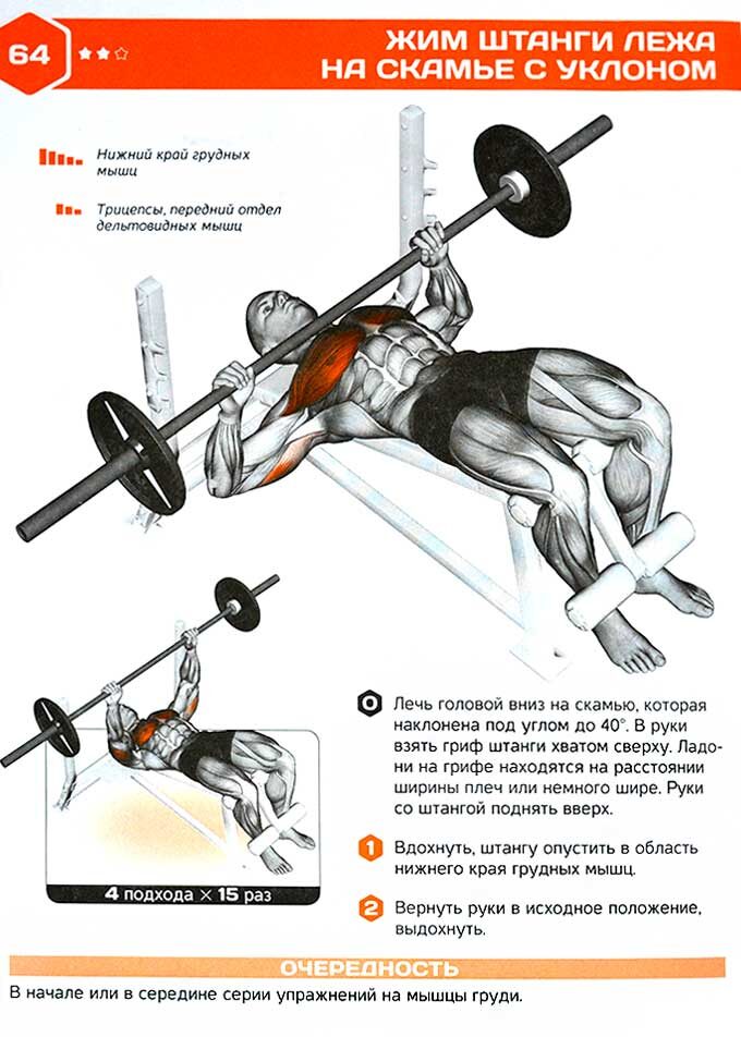 Жим штанги головой вниз — упражнение, которое выполняется на обратнонаклонной гимнастической скамье, при этом голова находится ниже плеч. Основная нагрузка приходится на нижнюю часть груди. Техника выполнения: Некоторые рекомендации: Противопоказания: серьёзные проблемы с сердечно-сосудистой системой и гипертония.