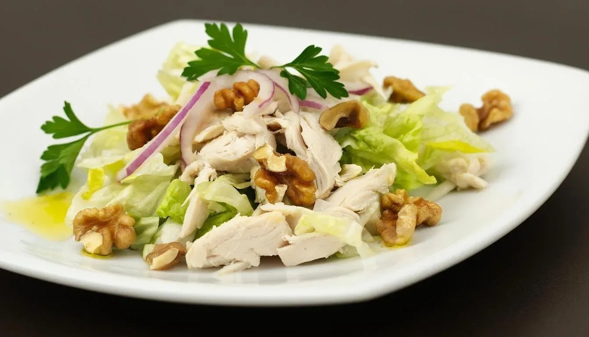 Такой салат получается сытным, полезным и очень вкусным. Вот несколько вариантов начиная от самого простого и классического. Вариант 1: Классический и простой (с майонезом) Этот рецепт — быстрая и сытная основа. Ингредиенты (на 2-3 порции): · Куриное филе — 1 шт. (около 200-250 г) · Куриные яйца — 3-4 шт. · Грецкие орехи — небольшая горсть (50-70 г) · Листья зелёного салата (Айсберг, Романо, Корн) — небольшой пучок или полкочана Айсберга · Майонез — для заправки (3-4 ст. ложки) · Соль, перец черный молотый — по вкусу Приготовление: 1. Подготовка курицы: Филе отварить в подсоленной воде до готовности (около 20 минут) или запечь в духовке. Дать полностью остыть и нарезать небольшими кубиками. 2. Яйца: Яйца отварить вкрутую (8-10 минут после закипания), остудить в холодной воде, очистить и нарезать кубиками. 3. Орехи: Грецкие орехи слегка обжарить на сухой сковороде 3-4 минуты до появления аромата. Остудить и крупно порубить ножом. 4. Салат: Листья салата хорошо промыть, обсушить