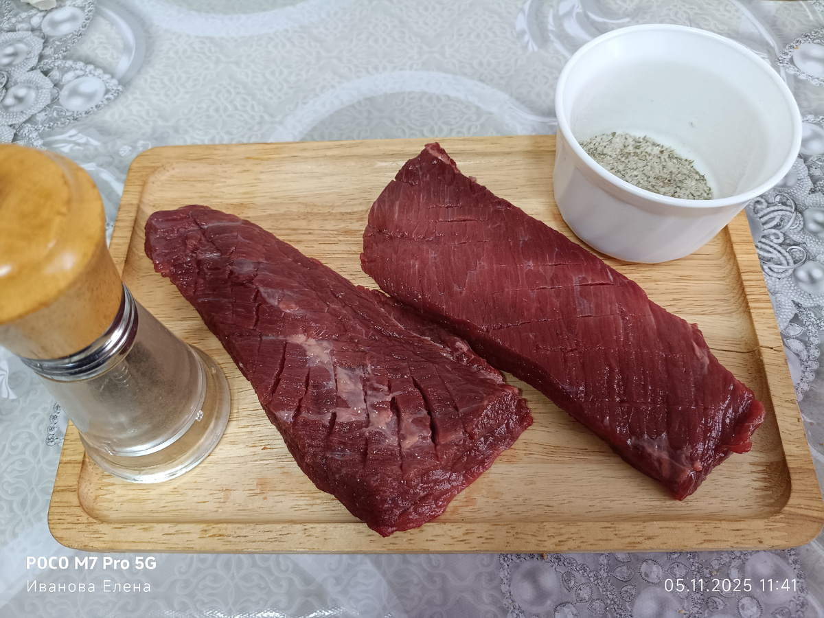 Муж вчера явился с работы в ночную смену с насморком. Причина насморка не выявлена, но по факту не простуда. Однако никуда не пошли. Хотели в ресторан, потом на антрепризу в Дом актера, но остались дома. Раз остались дома и день рождения, надо вкусно поесть, значит. Любим мы мясо. Вот такие у меня пара кусочков. Я их надрезала еще, зачем? Больше для красоты, ну и чтобы при жарке форму держали. Натерла солью с перцем. Обжарила на сливочном масле. На среднем огне, по три минуты с каждой стороны. Потом выложила на фольгу, растерла в ладонях розмарин. Запечатала в фольгу и убрала в духовку, тут никаких рекомендаций давать не буду, вкусы у всех разные. Я убирала в духовку с целью, чтобы не было красного сока. Очень тонкая грань, когда передержишь чуть-чуть в духовке и получится «резиновая подошва». Духовки у всех разные, кто-то любит мясо с кровью, кто-то категорически этого не приемлет. Поэтому повторю еще раз, что я не профессиональный повар и многие рецепты адаптированы лично для нас, мы