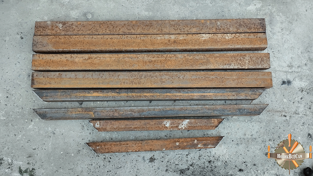 Основу верстака решил делать из остатков металла. Из металлопрфиля 4х4 см отпилил две заготовки длиной 88 см и две длиной 50 см, запилил края под 45 градусов. Из металлопрофиля 4х6 см отпилил четыре заготовки под ножки, длиной 90 см.