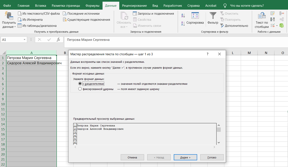 Если бы данные были через запятую (Петрова, Мария, Сергеевна), ставили бы галочку «запятая».
