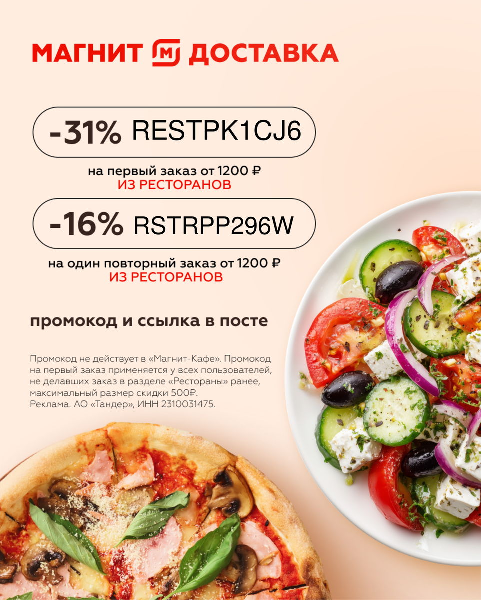 Готовые блюда из кафе и ресторанов в приложении «Магнит» Нет времени готовить ужин? Ну и не нужно, ведь всегда можно заказывать вкусные роллы, сытную пиццу, сочные бургеры или оригинальные десерты. Тем более что сейчас, в приложении «Магнит», открылся раздел «доставка из ресторанов». Пока действует выгодная скидка - балуйте себя RESTPK1CJ6 скидка 31% на первый заказ от 1200₽ RSTRPP296W скидка 16% на один повторный заказ от 1200₽ в разделе «Рестораны» в приложении «Магнит» https://magnitrest.prfl.me/6238cc608d70de4bf05c082d/orwbkd?erid=2VtzqwZUjzD * Промокод на первый заказ актуален для всех, кто делает заказ в разделе «Рестораны» впервые. Важно сделать первый заказ именно в этом разделе! Промокод не действует в «Магнит-Кафе». Максимальная сумма скидки – 500 ₽. Реклама, АО «Тандер», ИНН: 2310031475