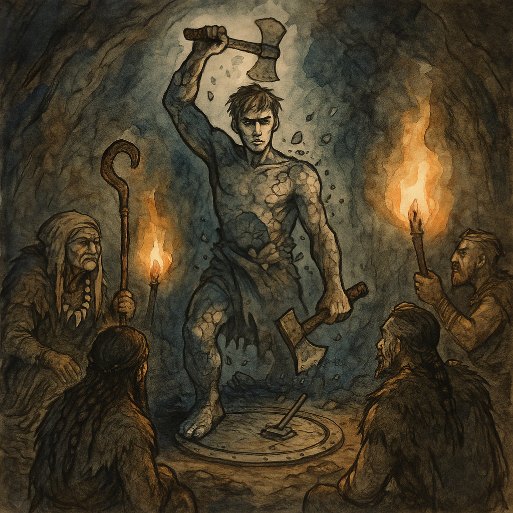Жрица и вождь молча смотрели, как Каменный бог ударил топором в пол. Раздался звон. Бог бил и бил до тех пор, пока что-то не хрустнуло, и топор не развалился на части.