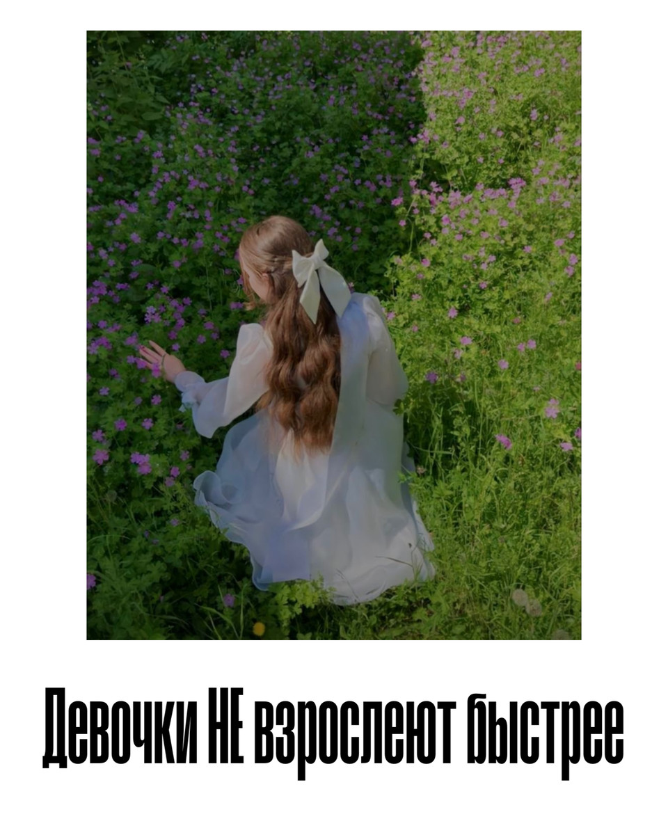 Говорят, девочки взрослеют раньше мальчиков. Но, может, дело не в том, что они «взрослеют», а в том, что их слишком рано заставляют быть взрослыми? Пока мальчики в детском саду дерутся за машинку и спокойно остаются «детьми», девочек уже учат быть «правильными». Не кричи. Не пачкай платье. Не спорь. Помоги. Уступи. Девочек приучают к ответственности, к аккуратности, к тому, чтобы не мешать. А мальчикам разрешают всё — шуметь, рисковать, пробовать, ошибаться. А потом у них до сорока лет детство. Но несмотря на это, именно они получают привилегии в обществе — глава семьи, руководящие должности, статус, уважение. Девочки взрослеют быстрее, но никаких привилегий они за это не получают. Патриархат делает их взрослыми слишком рано — и при этом оставляет на вторых ролях.