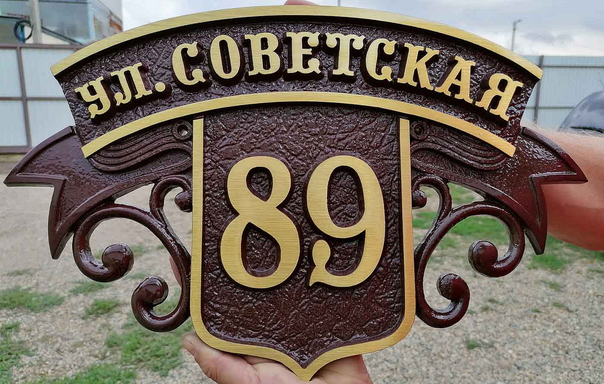 - Не бойтесь индивидуальности. Табличка может быть в форме герба, овала, щита — главное, чтобы она не спорила с фасадом.