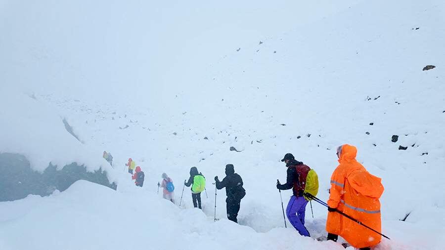 Лагерь, в котором заблокированы люди, находится на высоте 4,9 тыс. м. Однако для спуска вниз им необходимо преодолеть перевал, находящийся на высоте 5 тыс. м. При этом выпавший снег затрудняет этот путь.