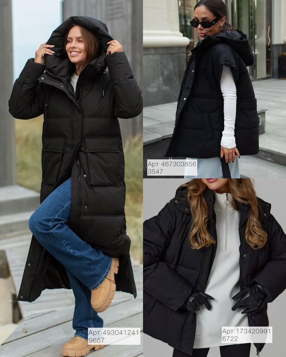 - Верхняя одежда: длинный пуховик 493041241, короткий пуховик 173420991, жилетка 467303856, шубка 505484581.