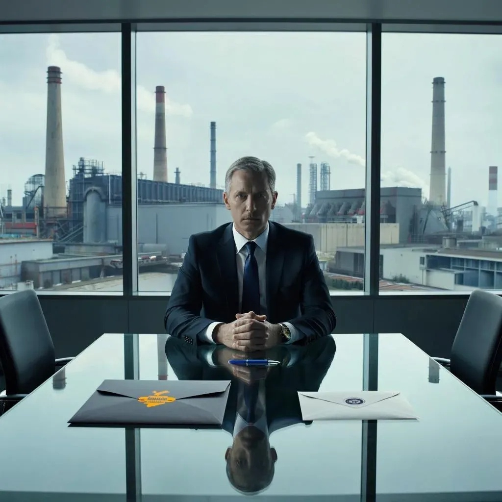 Стеклянный стол блестел. Вид из окна на заводской двор был идеальным.