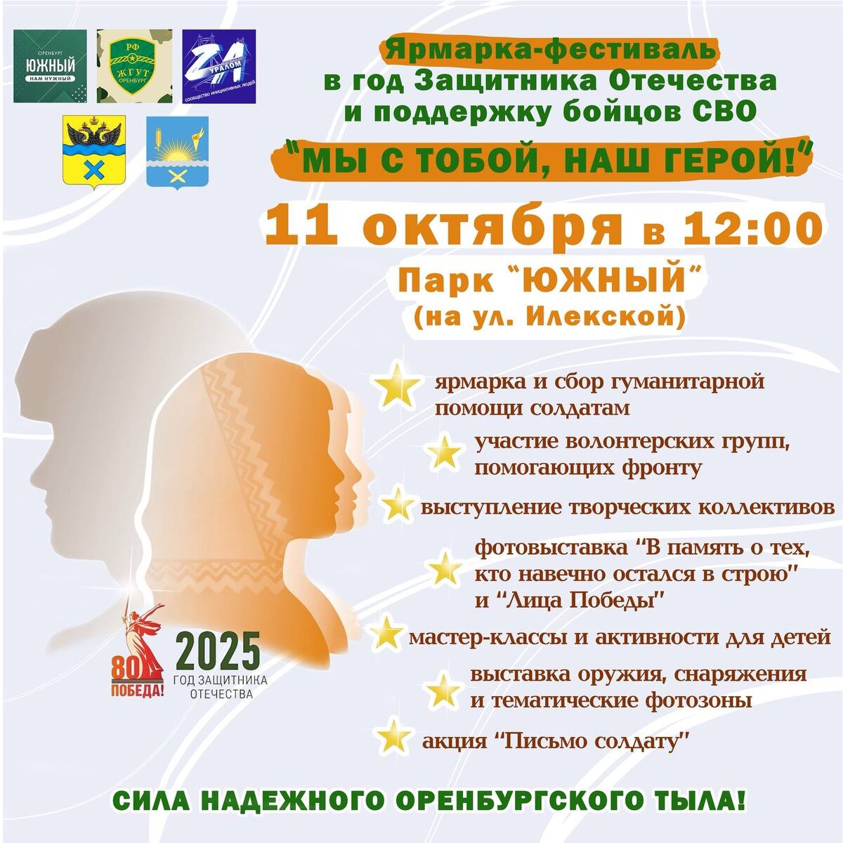 ЖГУТ Оренбург представляет : Приглашаем на благотворительную ярмарку -фестиваль «Мы с тобой наш Герой» в поддержку бойцов СВО 11 октября с 12:00 в парке «ЮЖНЫЙ» (ул. Илекская) Оренбург. В программе: 🌟 Участие волонтерских групп , помогающих фронту 🌟 Выступление творческих коллективов, артистов Оренбурга и Оренбургского района 🌟 Мастер -классы и активности для детей от дошкольных учреждений 🙏Фотовыставка «В память о тех, кто навечно остался в строю» 📸 🪖⛺️ Выставка оружия, снаряжения и тематические фотозоны. 🍫🫙🥨🧸 «Благотворительная ярмарка» Все средства , вырученные с продажи будут направлены на помощь бойцам