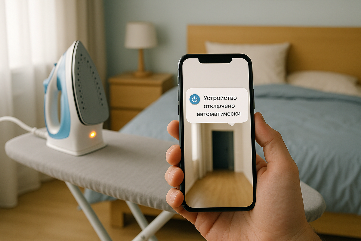 Через секунду приходит второе уведомление: «Устройство отключено автоматически. Температура снижается.» Сергей подключился к камере — всё спокойно. Свет выключен, утюг остыл.
