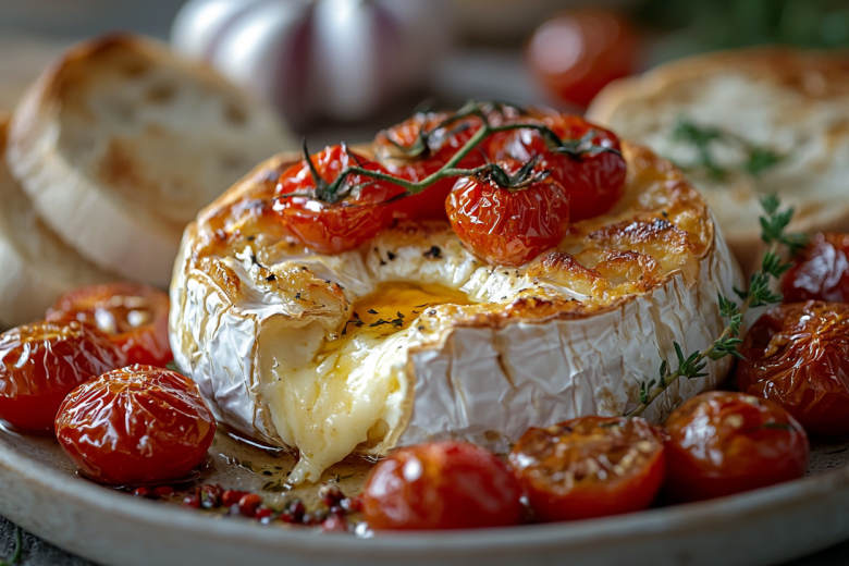 Выложите запечённый сыр на тарелку, рядом — багет, помидоры и чеснок. Украсьте свежими травами и подавайте сразу.