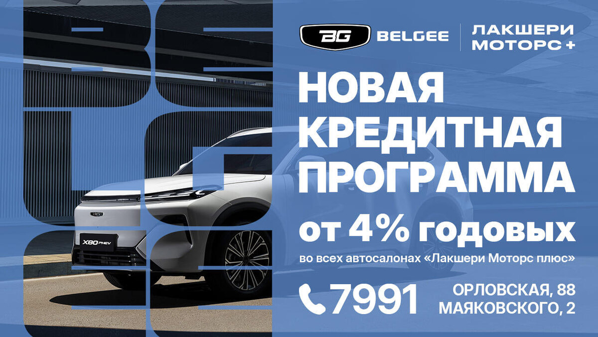 Осень в автоцентрах «Лакшери Моторс плюс» на Маяковского, 2, и Орловской, 88 началась с отличных новостей – цены снизились, а модельный ряд пополнился новейшим гибридным кроссовером BELGEE X80 PHEV. Сегодня у нас новый повод – официальный дилер BELGEE объявил о новом выгодном кредите от 4% на весь модельный ряд. Кредит выдает банк «БНБ-БАНК» на 10 лет. Первые три года (36 месяцев) действует льготный период со ставкой 4% годовых. На сегодняшний день это самый продолжительный «грейс-период» на рынке автокредитов. Ставка по его окончанию составит 16,5%.Условия приобретения автомобилей BELGEE отличаются в зависимости от модели.BELGEE X80 PHEV – новый флагман отечественного автопроизводителя. Интерес к модели огромный, и это закономерно – новый гибридный кроссовер ездит на бензине и на электричестве, запас хода – 940 км, расход как у малолитражки, опции и комфорт как в премиальном классе. Это ли не белорусская мечта?Минимальный первоначальный взнос для приобретения BELGEE Х80 PHEV – 40%. Ег