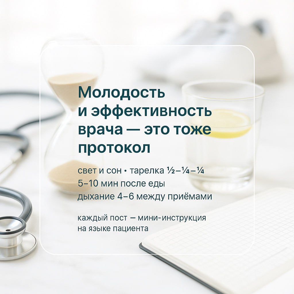 Молодость и эффективность врача — это тоже протокол. Вы отлично лечите других. А свой режим? Мы собрали короткие посты, которые работают и для пациентов, и для врача: 🌞 свет и сон — яснее голова; 🍽 тарелка ½–¼–¼ — меньше вечерних «качелей»; 🚶 5–10 мин после еды — метаболический «must»; 🫁 дыхание 4–6 — быстрый «выдох» между приёмами. Каждый пост — мини-инструкция: 3–5 пунктов, без «магии», на языке пациента. Заберите готовые шаблоны в 👉 канале нутрициологии https://t.me/mc_mfo_diet
