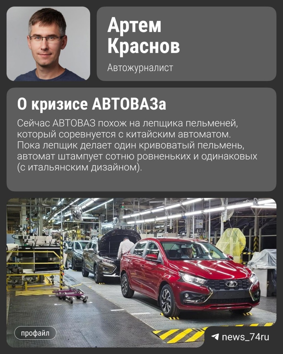 В чем причины нового кризиса АВТОВАЗа и чем это похоже на ситуацию 20-летней давности Несмотря на тепличные условия, созданные правительством, АВТОВАЗ сталкивается с проблемами на рынке. Наш автожурналист Артем Краснов проанализировал данные последних месяцев для автопроизводителя и поделился мнением, почему так случилось. 🟥 На заводе ввели четырехдневку. Новый график — не привилегия, а скорее необходимость из-за падения спроса. Линия по выпуску «Гранты» и «Искры» работает в две смены, а нитки, где собирают «Весты» и «Нивы», — в одну. Продажи «Весты» в последние месяцы упали почти вдвое, «Нива» рискует выпасть из топ-10 популярных моделей. В этом году завод планировал выпустить и продать 500 тысяч машин, сейчас говорят о 300+ тысячах. 🟥 Цены и утильсбор. Артем Краснов считает, что АВТОВАЗ не слишком изобретателен в своих подходах. Завод дважды лоббировал повышение утильсбора. В следующем году на машины, сходные по классу с «Ладой», сбор вырастет до 800 тысяч — это сравнимо с ценой