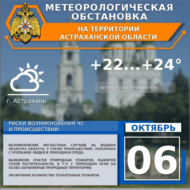 🌎Метеорологическая обстановка на 5 октября. 🌤На территории области небольшая облачность. Без осадков.💨 Ветер западный, по югу юго-восточный 4-9 м/с. 🌡Температура воздуха днем +20...+25°, ночью +6...+11°. 🍂По г. Астрахань небольшая облачность. 🌤 Без осадков. Ветер юго-восточный 4-9 м/с. 🌡Температура воздуха днем +22...+24°, ночью +8...+10°. ✅Присоединяйся к МЧС Астрахань 👉Подписывайся на МЧС России в Telegram | MAX
