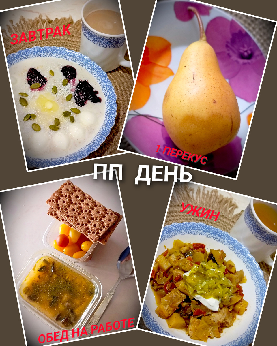 Вчерашний день прошел под знаком правильного питания, даже несмотря на рабочие будни. Утро началось с сытной и полезной каши из овсяных отрубей. Добавила к ней немного сливочного масла, несколько шариков моцареллы для сытности , а также капельку сливового варенья для сладости. Все это запила ароматным кофе с молоком , конечно без сахара. Первый перекус был легким и освежающим – сочная груша. На обед я взяла с собой домашний суп из куриной грудки с шампиньонами. К нему добавила горсть помидорок черри и пару хрустящих хлебцев. Весь день пила просто воду. Признаюсь, второго перекуса сегодня не случилось. Честно говоря, просто забыла о нем позаботиться заранее. Нужно исправлять такие ошибки. 😉 Зато ужин порадовал – овощное рагу с куриной грудкой и теми же шампиньонами. Для пикантности добавила ложку сметаны и немного соуса релиш. Завершила трапезу чашкой освежающего зеленого чая. В целом, день получился отличным, сытным с лёгким чувством голода между обедом и ужином. Стакан к