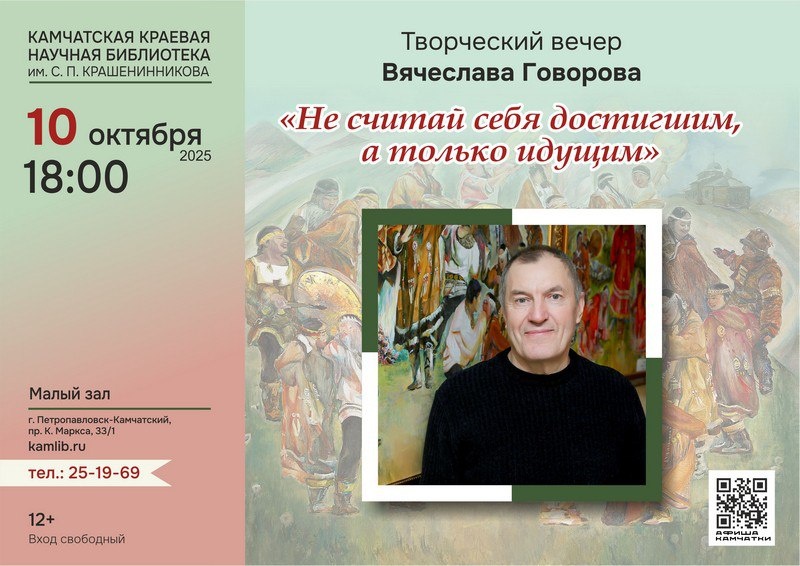 📌 Творческий вечер художника и поэта Вячеслава Говорова пройдет на Камчатке Юбилейный творческий вечер художника, поэта и автора-исполнителя Вячеслава Говорова «Не считай себя достигшим, а только идущим» пройдет 10 октября в Камчатской краевой научной библиотеке им. С.П. Крашенинникова, передает агентство «КАМЧАТКА-ИНФОРМ». Вечер начнется в 18:00 пятницы в малом зале библиотеки. Вход свободный. Возрастное ограничение: 12+. «Вячеслав Говоров — яркая личность в мире искусства: художник, поэт, автор-исполнитель песен и создатель детской сказки «Розовая чайка». С 1981 года Камчатка стала для него главным источником вдохновения. Также он пишет рассказы на корякском языке. В 2000 году Говоров был принят в Союз художников России. В своем творчестве он уделяет особое внимание коренным малочисленным народам Камчатки. Это его работы «Легенда о Мэнго», «Уйкоаль», «Манящие дали», «Кочевник» и многие другие. Важное место в его искусстве занимает иконопись – «Апостолы Петр и Павел», «Сергий Рад