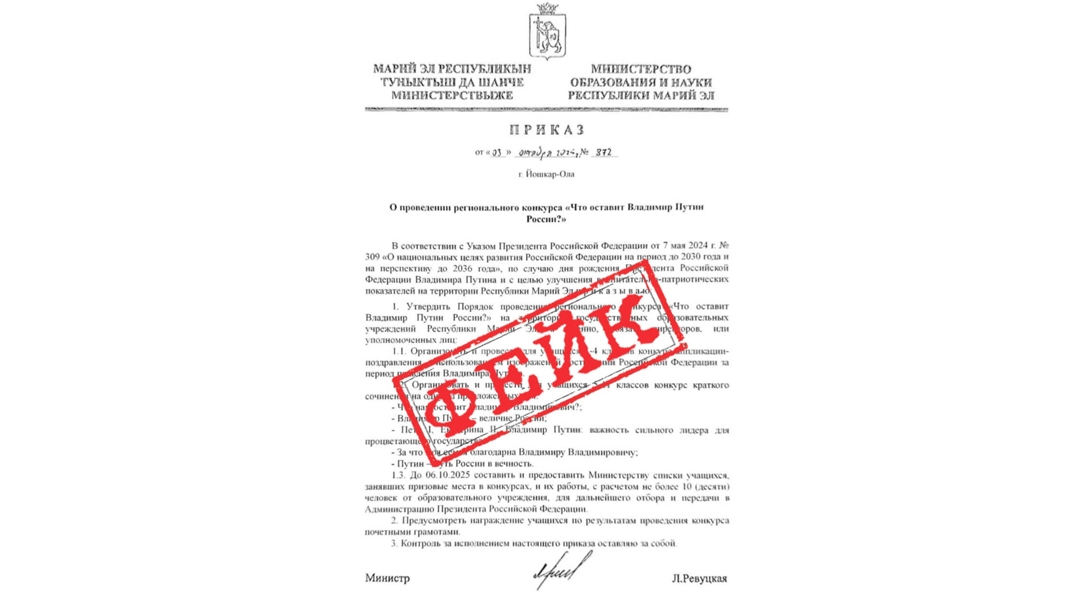 В интернете и социальных сетях распространяется поддельный документ за подписью министра образования и науки Марий Эл. Ложный приказ сообщает о проведении регионального творческого конкурса, посвященного дню рождения президента России Владимира Путина.