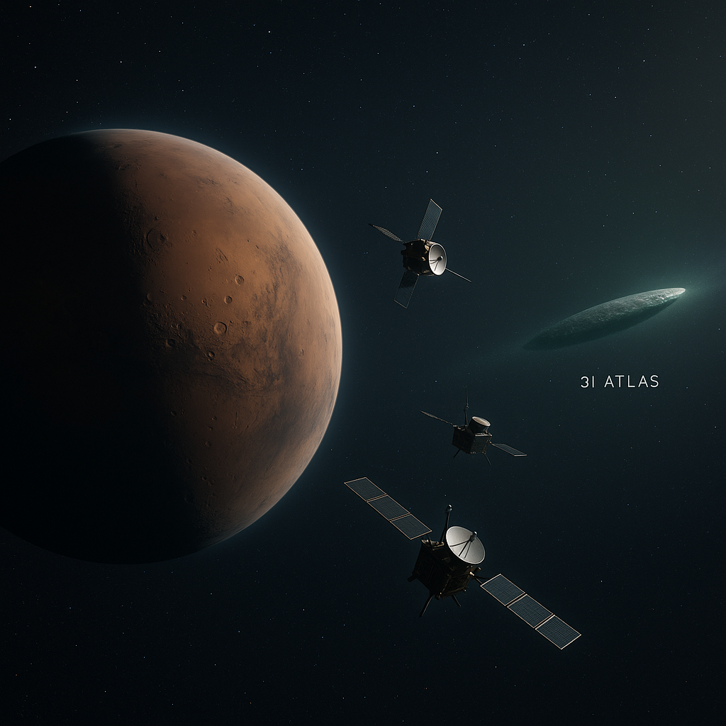 Межзвёздный объект 3I ATLAS пролетел всего в тридцати миллионах километров от Марса. Это событие должно было стать одной из самых ярких страниц современной астрономии: пять космических аппаратов — американский Mars Reconnaissance Orbiter, европейские Mars Express и ExoMars TGO, арабский Hope и китайский Tianwen-1 — наблюдали пролёт, готовясь передать на Землю уникальные снимки. Но по состоянию на 6 октября 2025 года — тишина. Ни одной фотографии, ни одного отчёта. Ни NASA, ни Европейское космическое агентство, ни Китай, ни ОАЭ не опубликовали ничего. Даже пресс-релизы, обещанные в первые дни после пролёта, не появились.