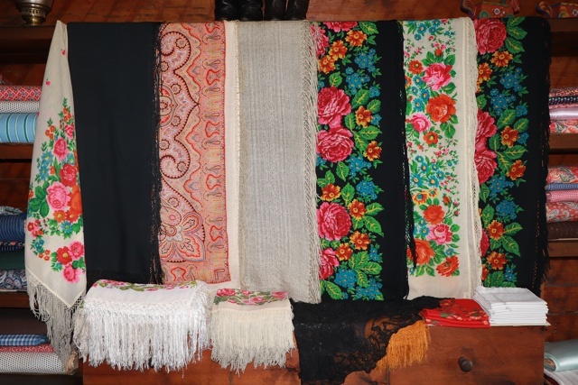 В конце XIX – начале XX веков платки были неотъемлемой частью женского костюма абсолютно любого сословия. В экспозиции торговой лавки #МузейШу представлена большая коллекция павлопосадских шалей и платков. Часть платков относится к началу XX века и изготовлены в Красноярском крае, некоторые – в г. Павловский Посад в 60-х годах XX века. Они были приобретены специально для экспозиции. Платки выполнялись из полупрозрачной или плотной шерстяной ткани, кашемира. Изначально в качестве основы платков использовали лишь три цвета – черный, свекольный и неотбеленный лен. На них создавали цветочные композиции с обилием ярких красок. В дальнейшем основа стала более разнообразной. В конце XIX века окончательно сформировался павловопосадский стиль с яркой цветочной россыпью. Самым популярным цветком на этих платках была роза – символ красоты и любви, а также изображали пионы, георгины. На платках можно встретить и скромные полевые цветы: ромашки, васильки, колокольчики. Были распространены рисунки в