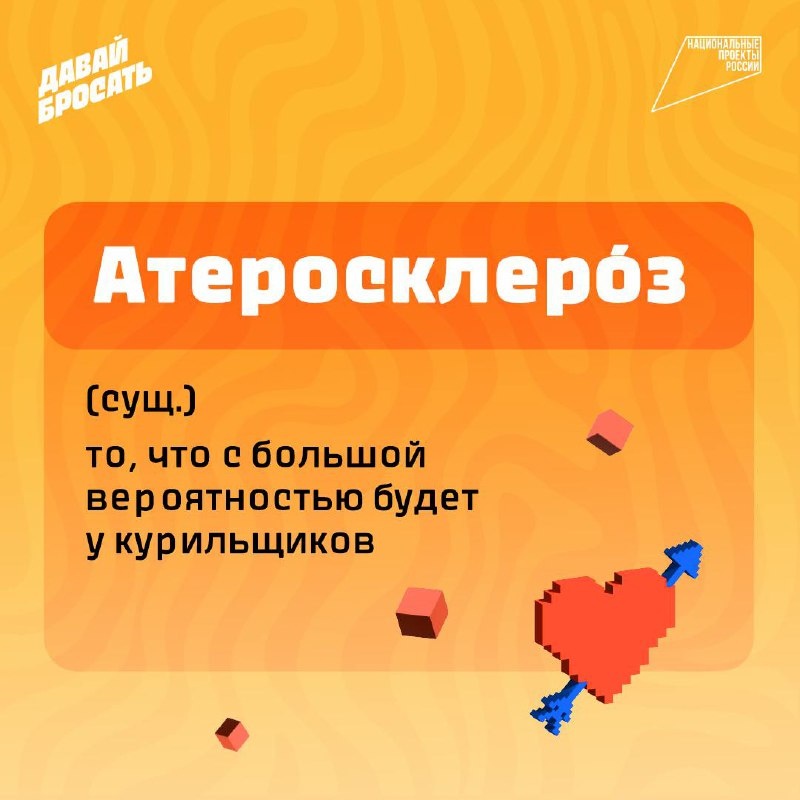 👆 Атеросклероз — это болезнь, при которой внутри артерий образуются холестериновые бляшки, ухудшающие кровоток. И он действительно становится частым последствием зависимости. Сосудистый хирург Руслан Геннадьевич Ховалкин рассказал, что почти 90% людей с тяжёлым атеросклерозом — курильщики. Их сосуды повреждены гораздо серьёзнее, чем у некурящих. Причём у тех, кто долгое время употребляет никотин, болезнь, как правило, протекает в тяжёлой форме. А согласно статистике, продолжительность жизни сокращается в среднем на 10–15 лет — атеросклероз ведёт к инфарктам, инсультам и даже гангрене. Ставь лайк, если такие риски не стоят того, чтобы курить! И делись постом с друзьями, которым нужна дополнительная мотивация 🧐 #слово_эксперту